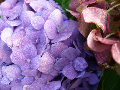 Morning sun on dewy flowers of the hydrangea .. new and old